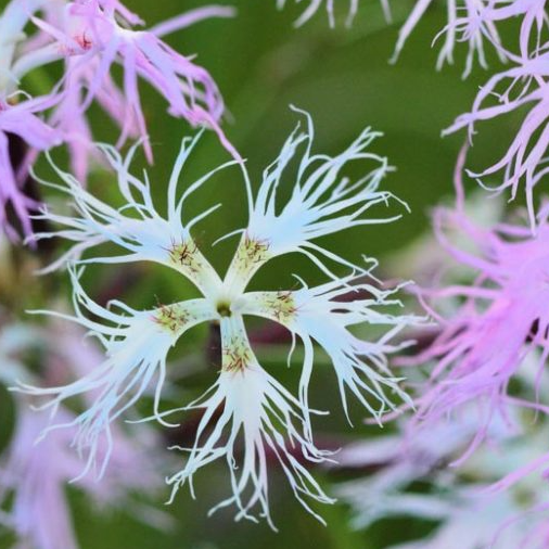 El Dianthus superbus, conocido como clavel plumoso, es una perenne elegante y aromática originaria de Europa y Asia. Sus pétalos finamente recortados, en tonos rosados a lila, le dan un aspecto etéreo y silvestre, aportando textura, perfume y liviandad a borduras, praderas florales y jardines naturalistas.